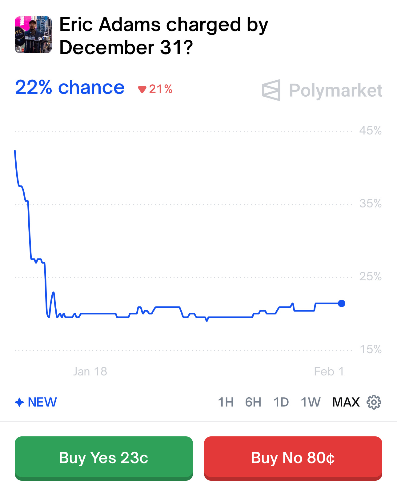 📊 There’s a 22% chance that Eric Adams is charged for crimes by the end of the year, according to Polymarket traders. (down from 43% a few weeks ago, when this story was fresh).