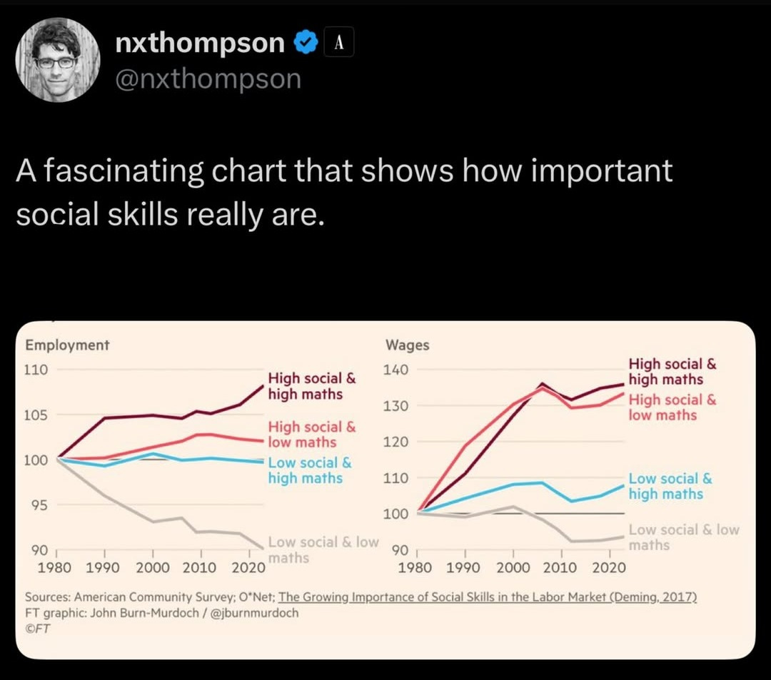 PLUS, people with "high social skills + low maths" make wayyy more money than "low social + high maths", study finds.