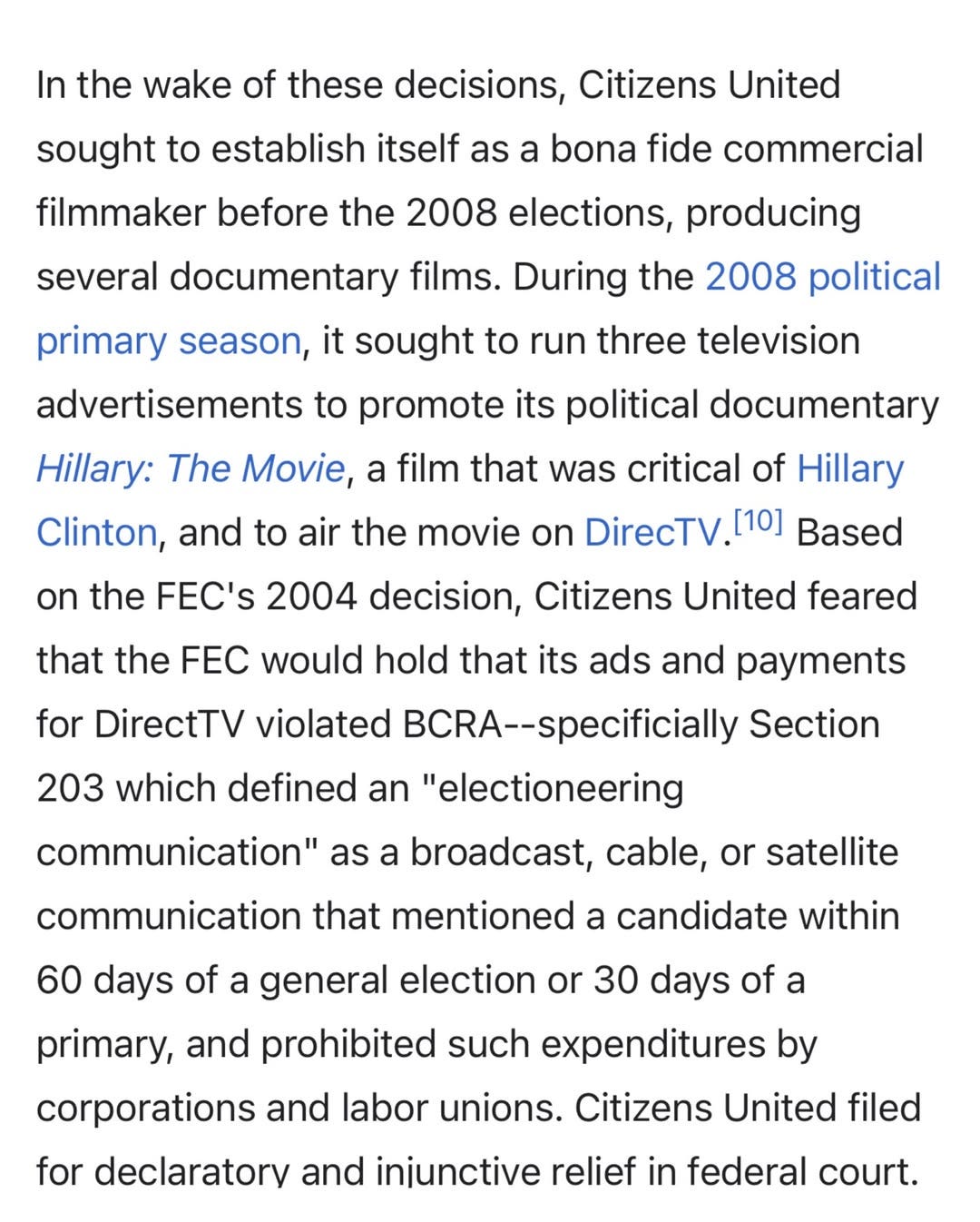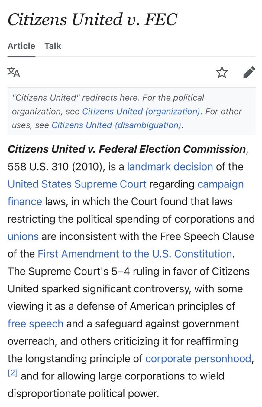 Some history on Citizens United from wikipedia:
