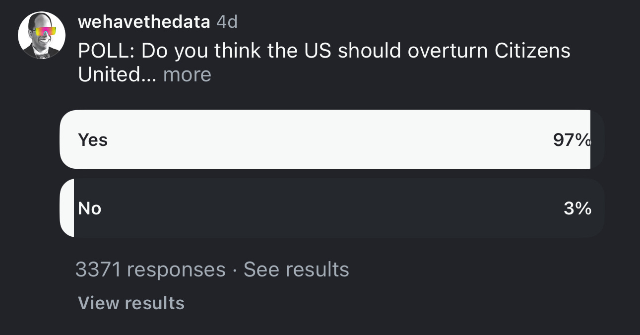 ๐ I ran a poll on IG asking people if they thought the US should overturn Citizens United. A whopping 97% of respondents said yes.