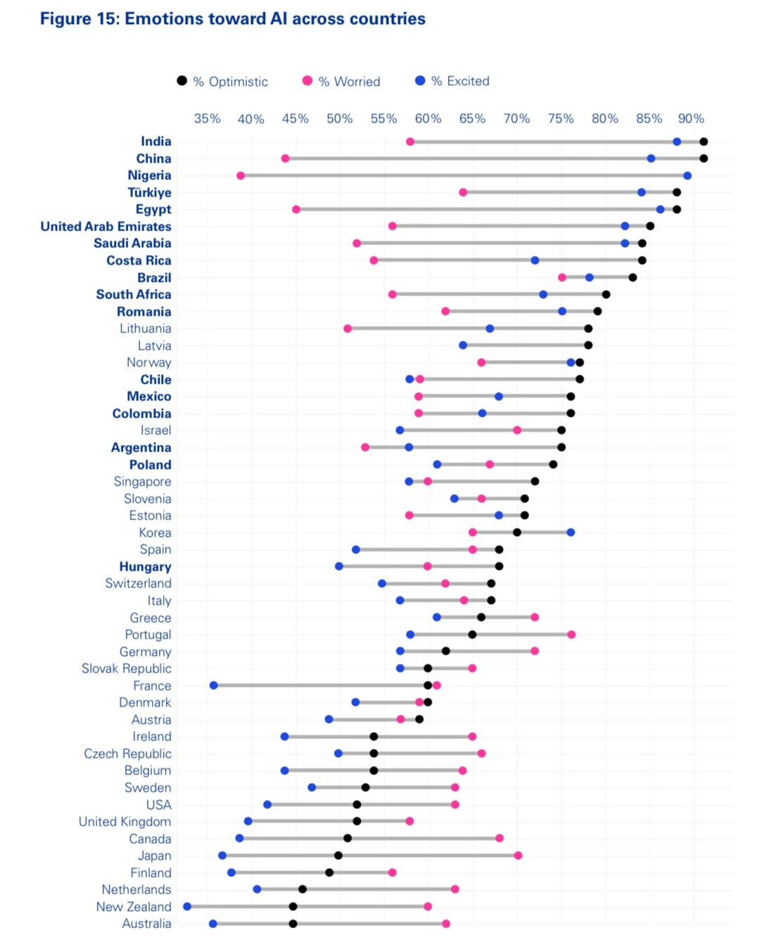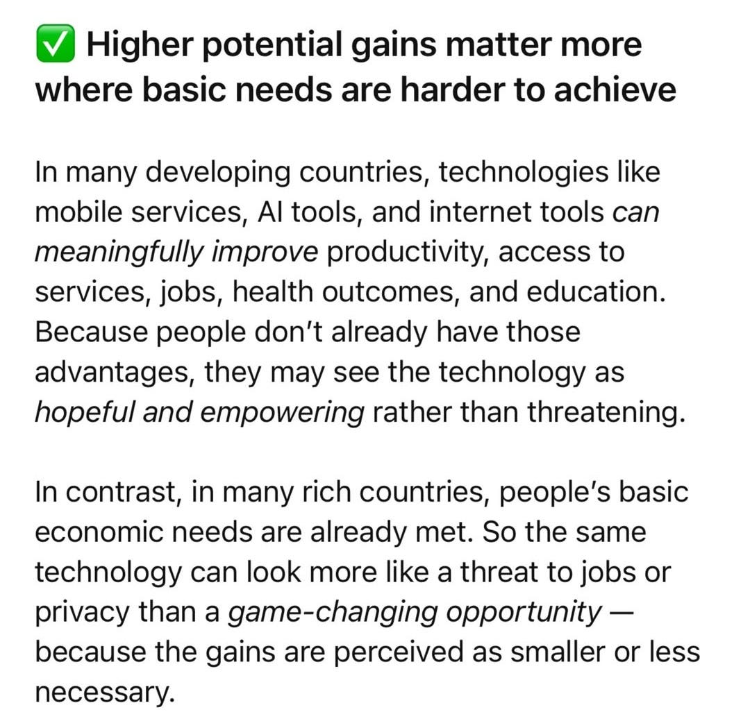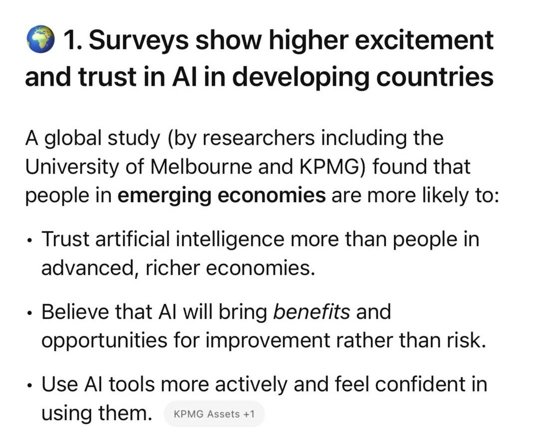 👉 Running the numbers: So 38% in developing/emerging countries are optimistic about AI, and that number drops to 24% in developed countries.