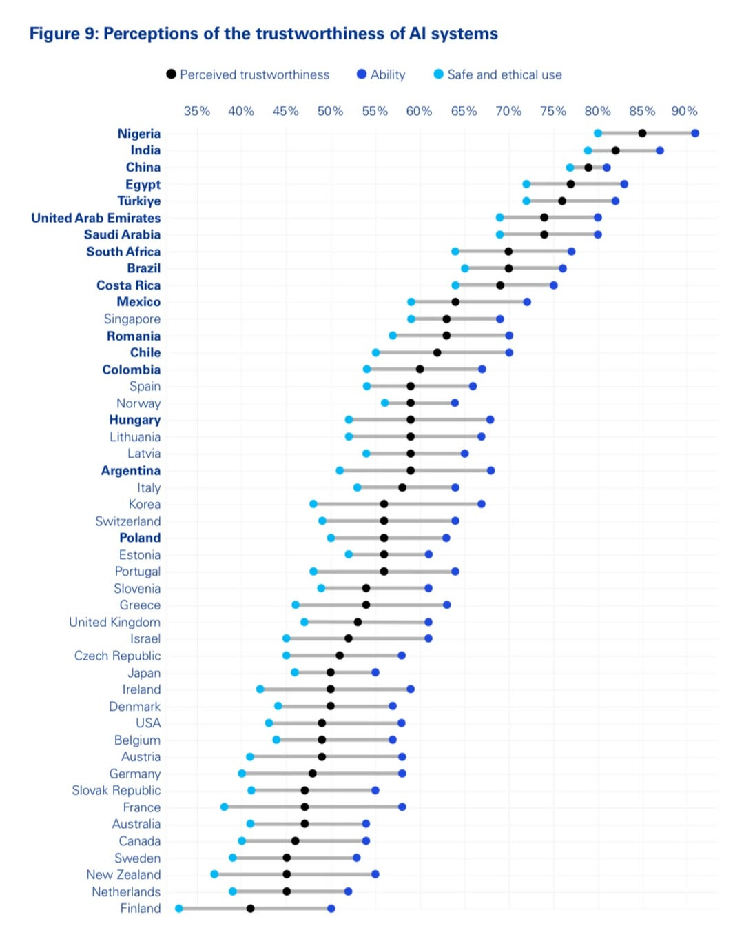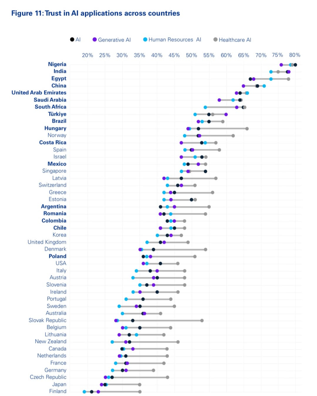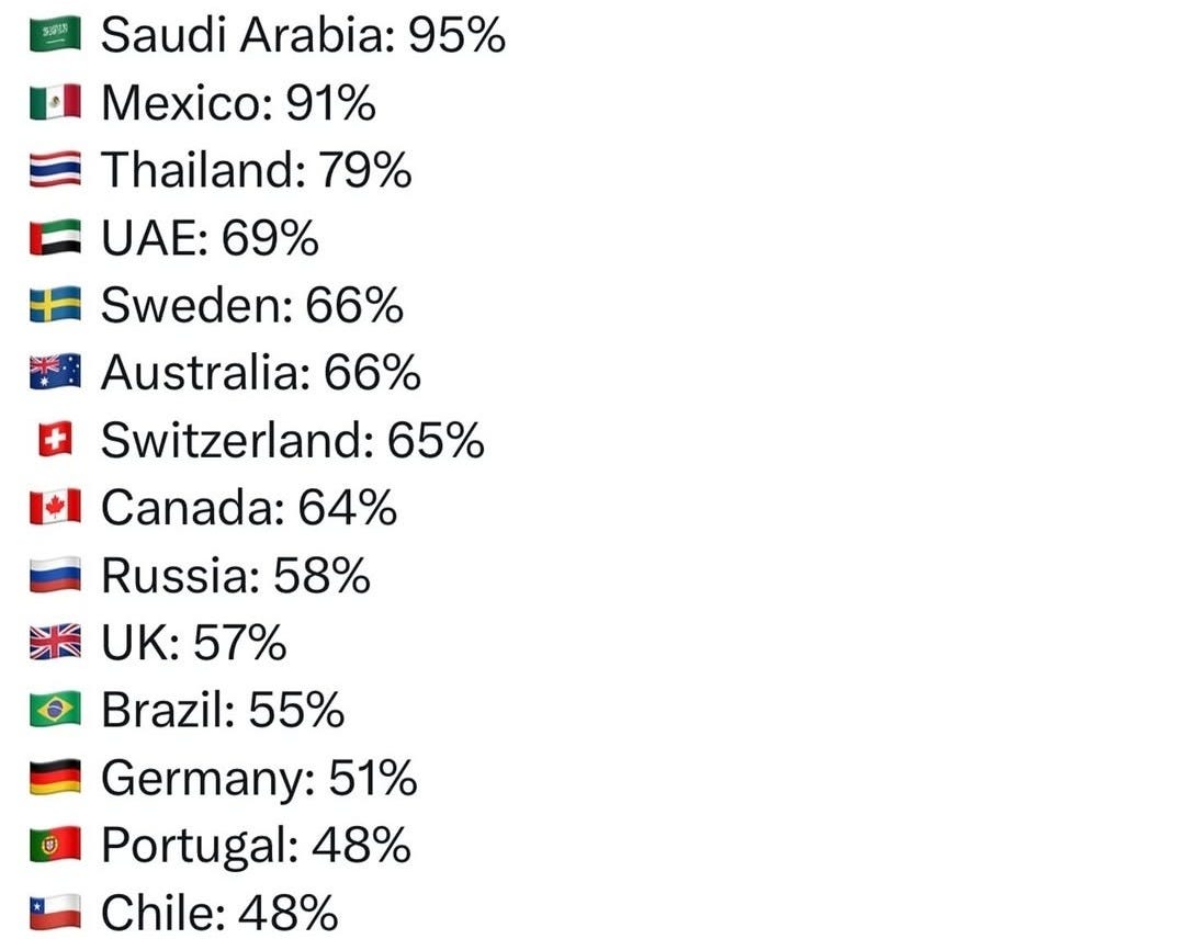 👉 Running the numbers: So 38% in developing/emerging countries are optimistic about AI, and that number drops to 24% in developed countries.
