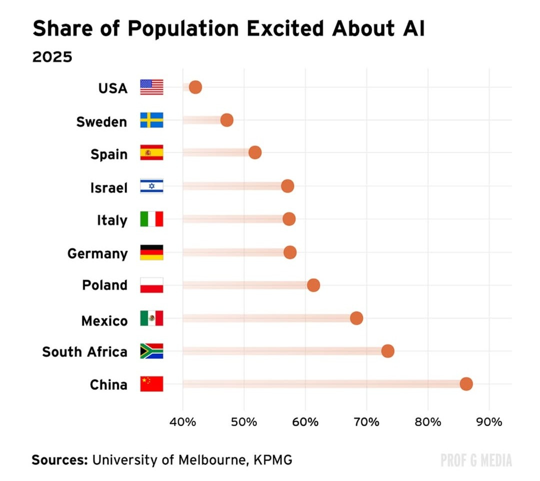 They say the sentiment about AI kinda seems to depend on where you live. People in developed economies tend to be pessimistic of it cuz it means a threat to the comfortable status quo, people from emerging economies tend to be optimistic, cuz it means a new opportunities for improvement.