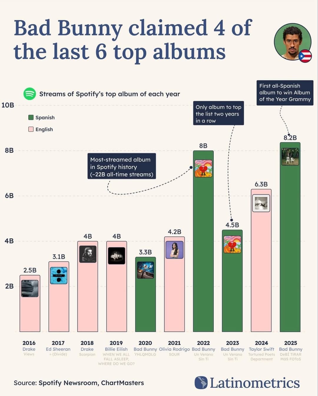 📈 Bad Bunny Claimed 4 of the Last 6 years’ Most Streamed Albums on Spotify