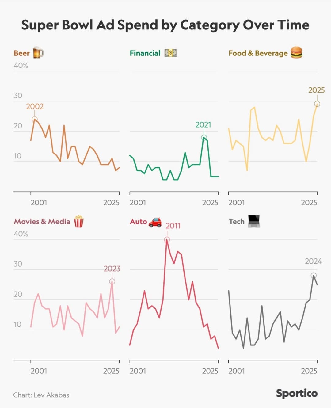 📈 Super Bowl Ad Spend by Category (2001-2025)