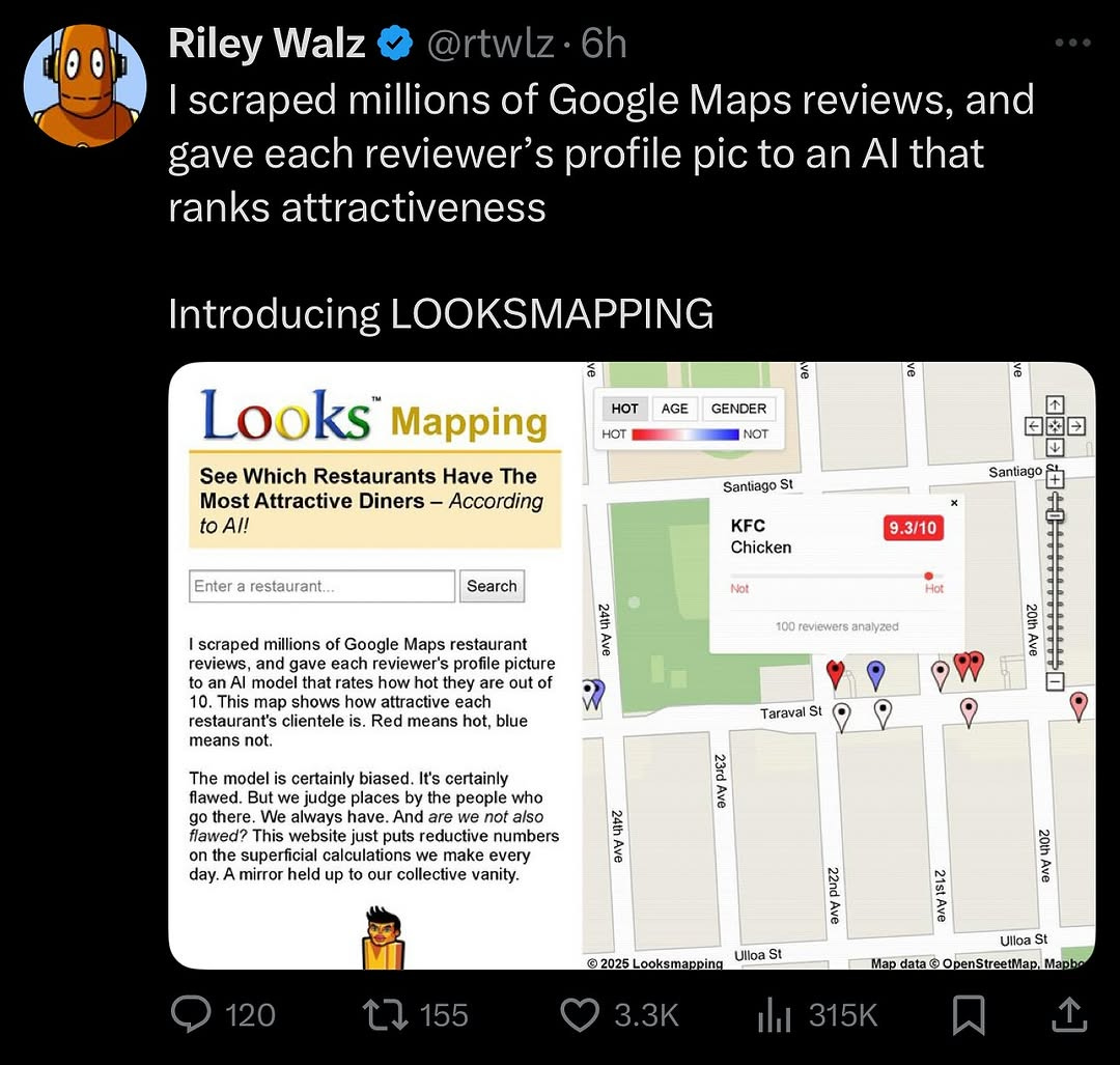 PLUS Man uses AI to rank the attractiveness of people who leave restaurant reviews on Google. Turns out KFC has the hottest customers.