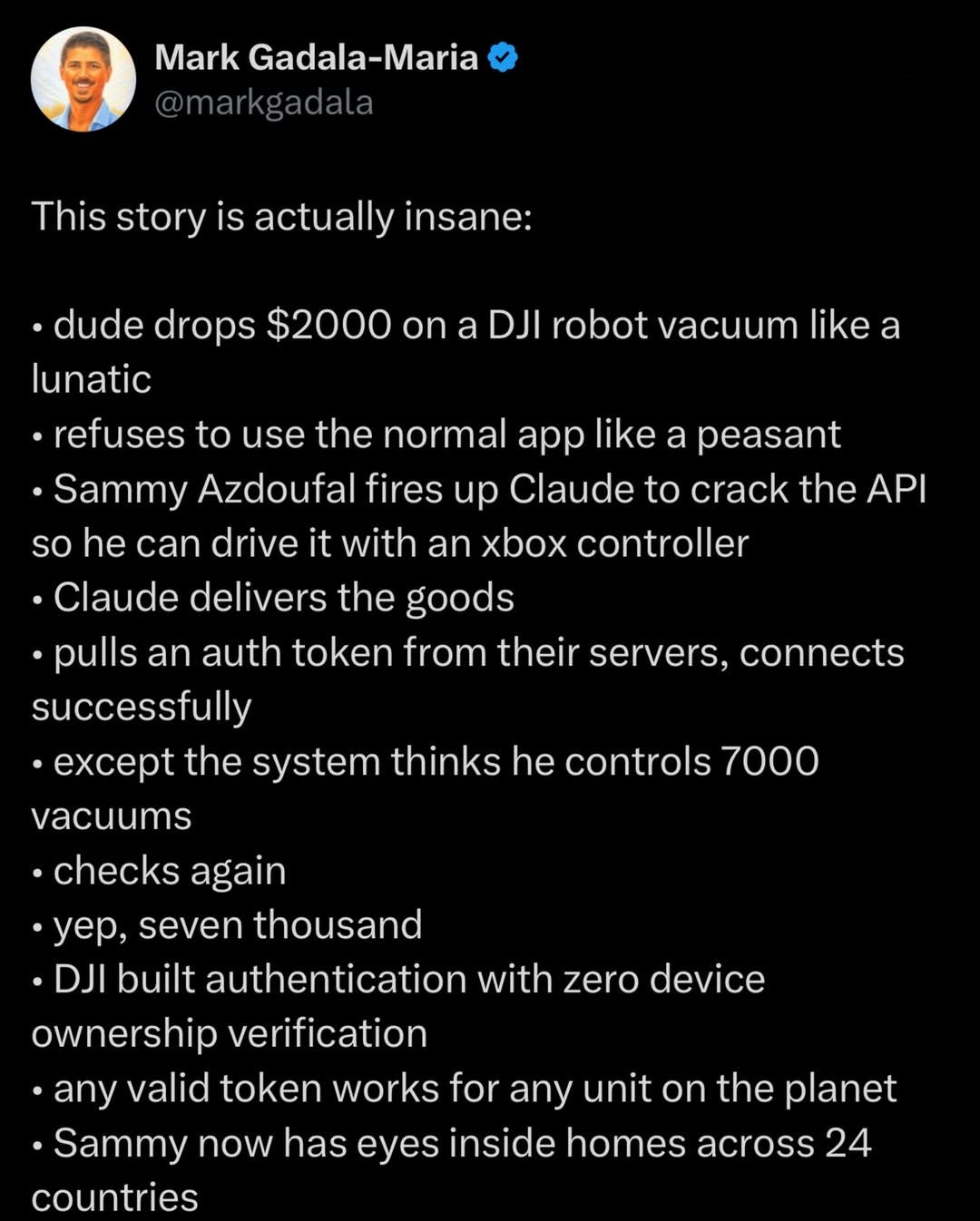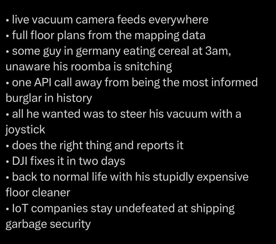 PLUS, tinkering man accidentally finds CCP backdoor into 7,000 DJI robot vacuums (allegedly).