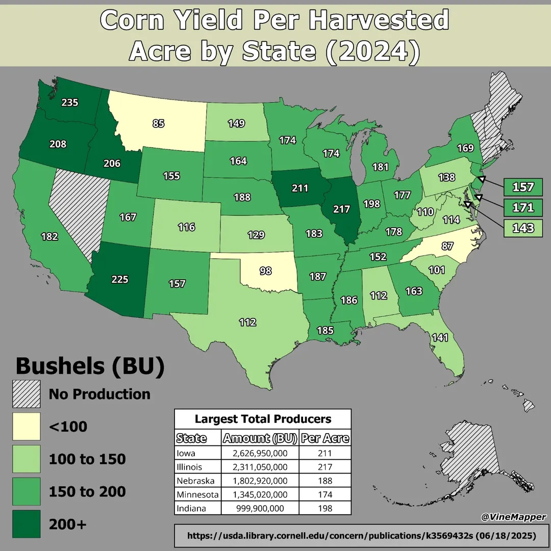 🌽 Corn Yield Per Harvest Acre by State (2024)