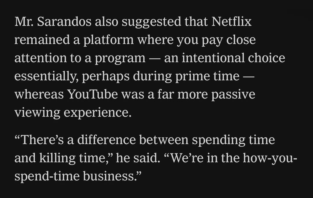 I want to see some data on the rise of scrolling. Feels like scrolling reels/tt is increasingly eating the time we used to spend watching shows. But I guess that would be “killing time” not “spending time” according to Sarandos.