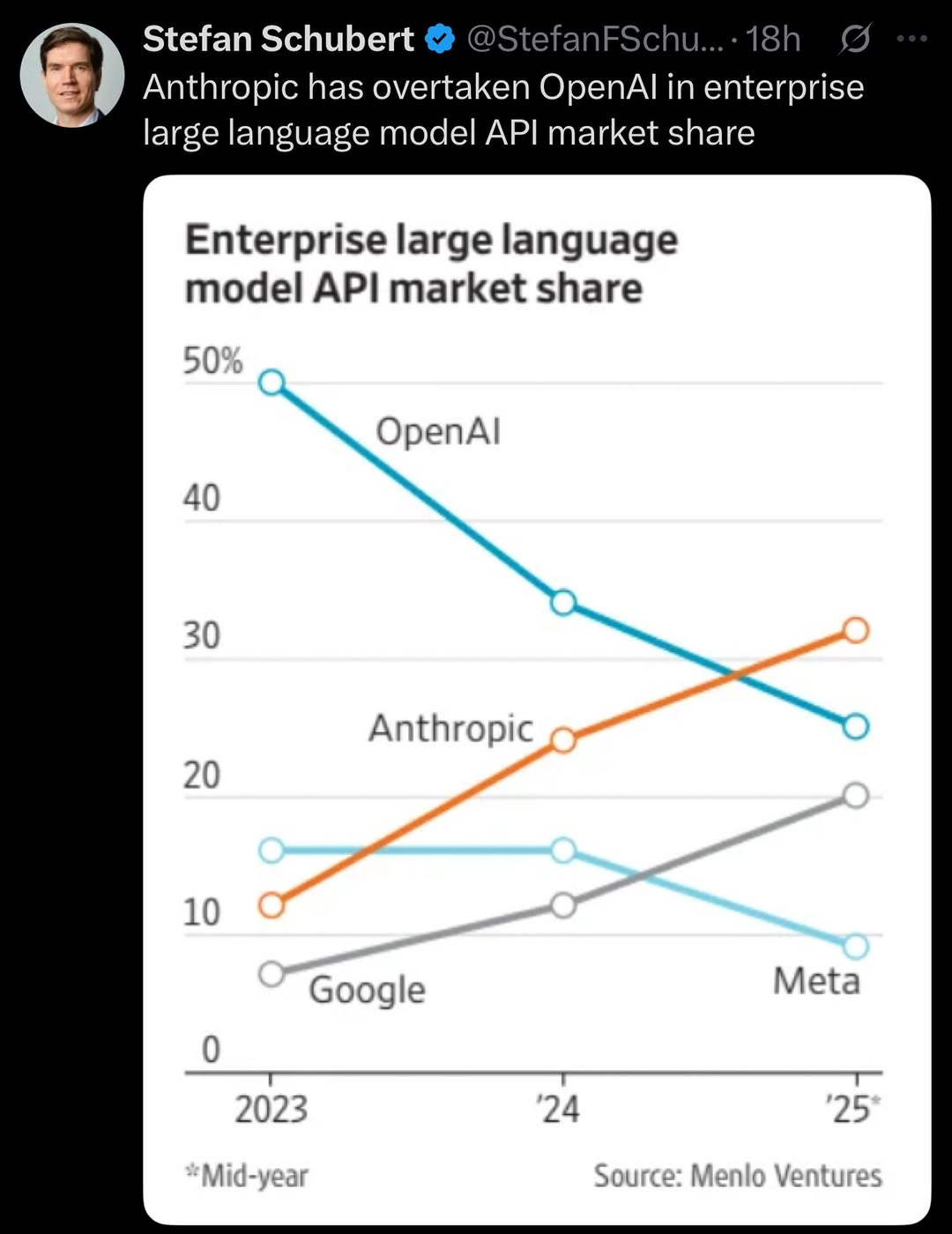 PLUS, Anthropic overtakes OpenAI in enterprise LLM API market share.