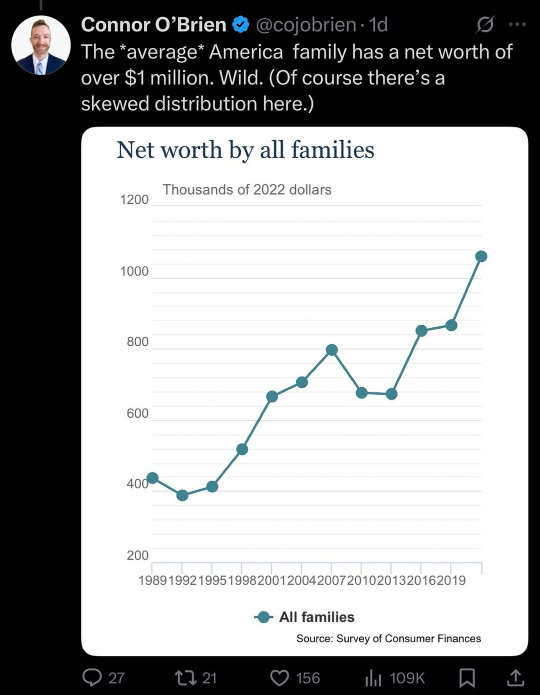 Also fascinating how vastly the different median and average are. Average family is 5x more wealthy and their net worth barely took a hit during the Great Recession.