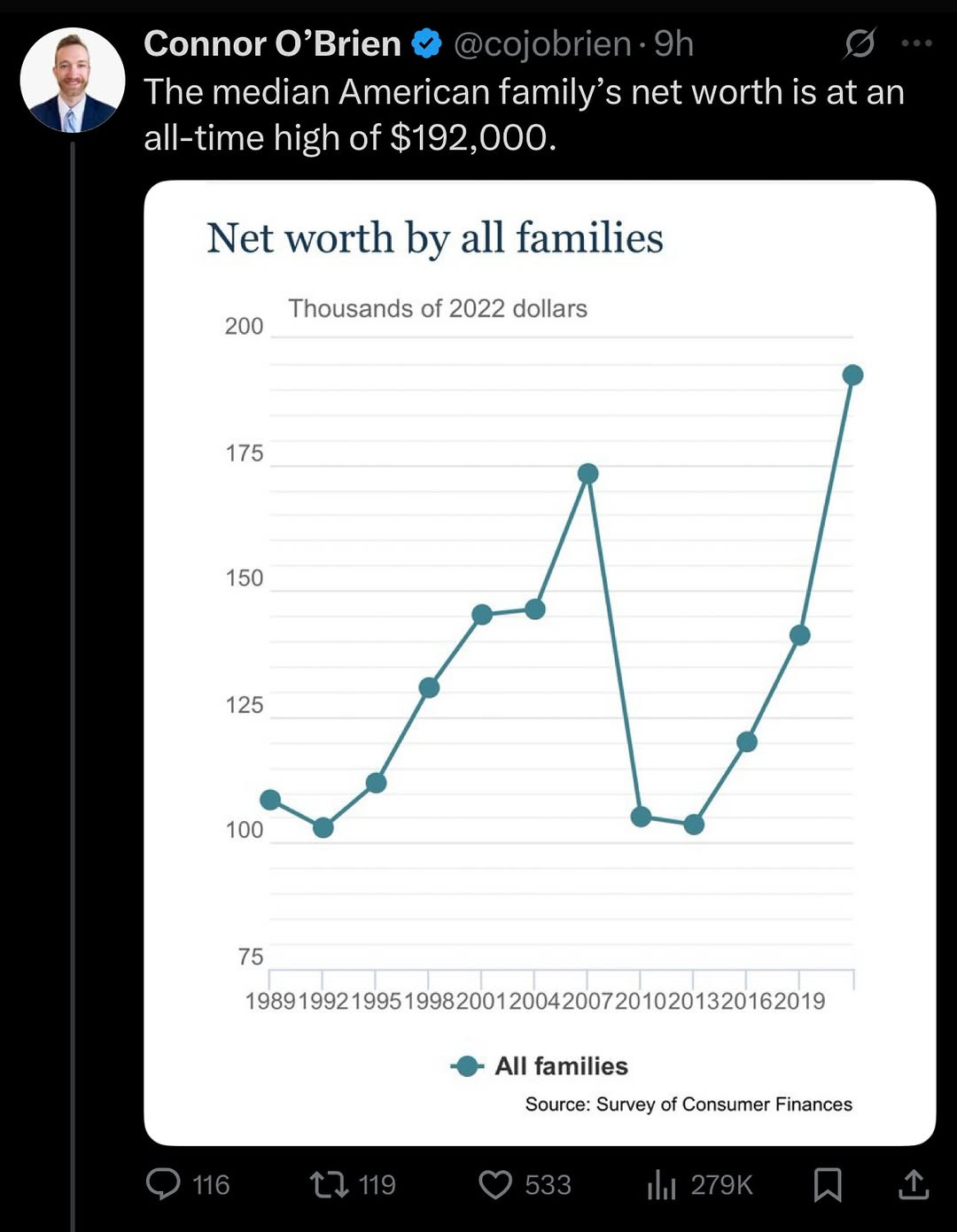 I didn’t realize people’s net worth had taken such a giant hit in the Great Recession. The median family lost like 45% of their wealth.