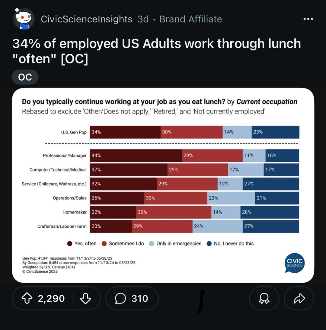 ⏰ 34% of U.S. Adults Work Through Their Lunch “Often”