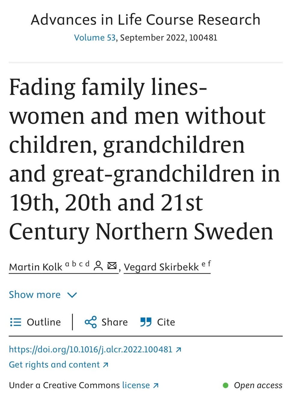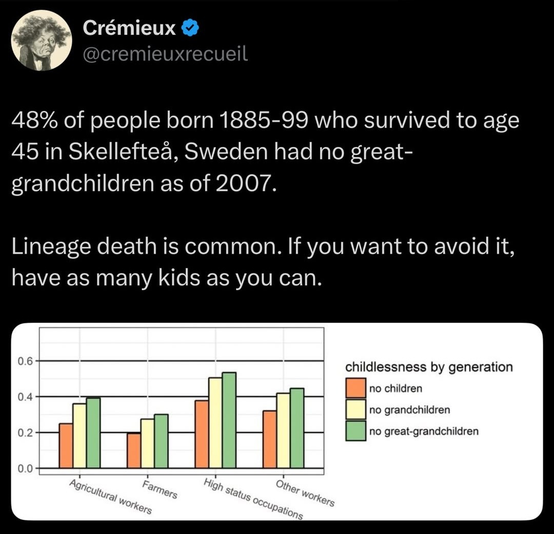 PLUS, in one Swedish city, almost half the old people suffered from lineage death - having no surviving great grandchildren.