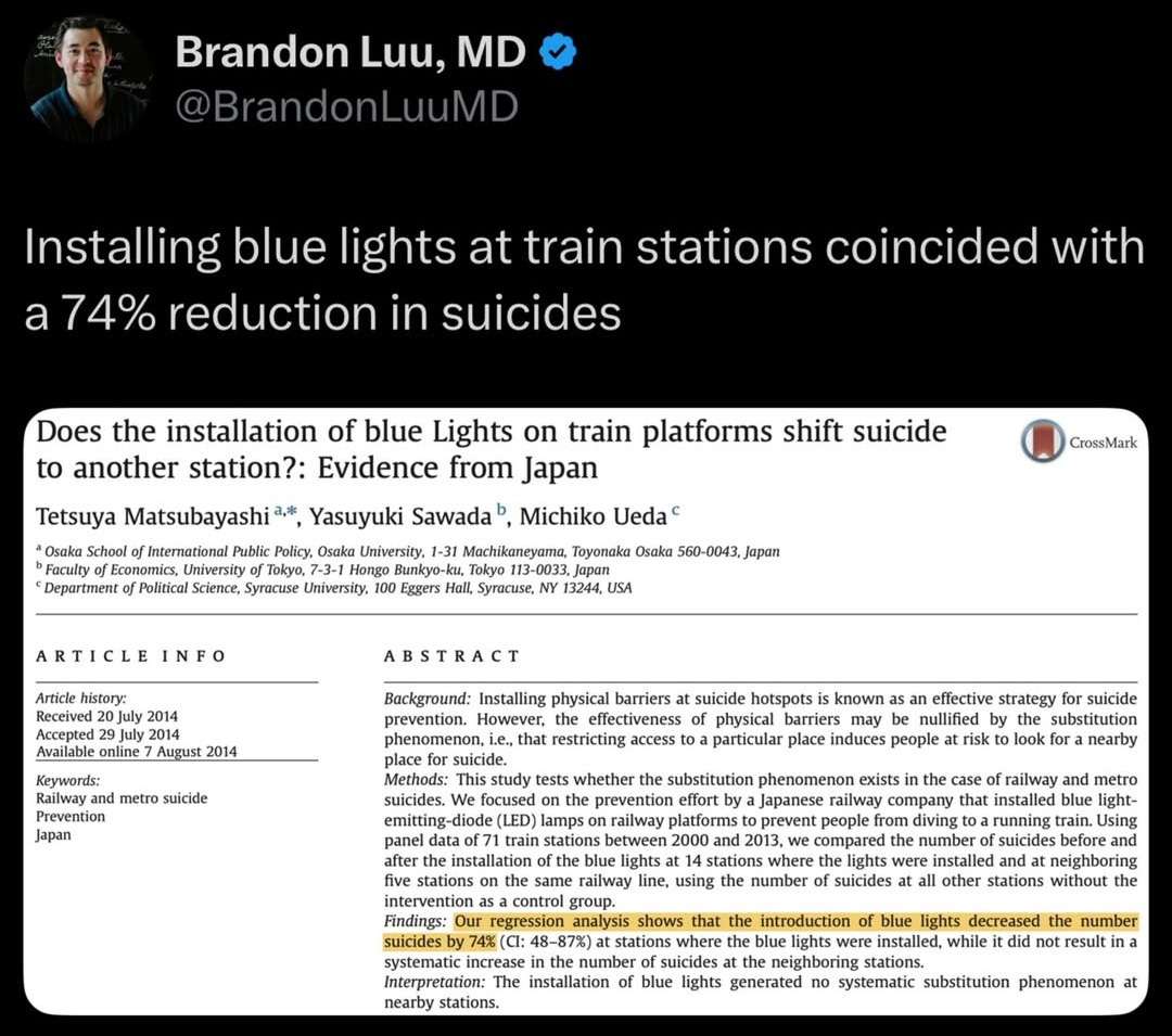 PLUS, blue lights installed at train stations coincide with 74% suicide reduction in Japan, study finds.