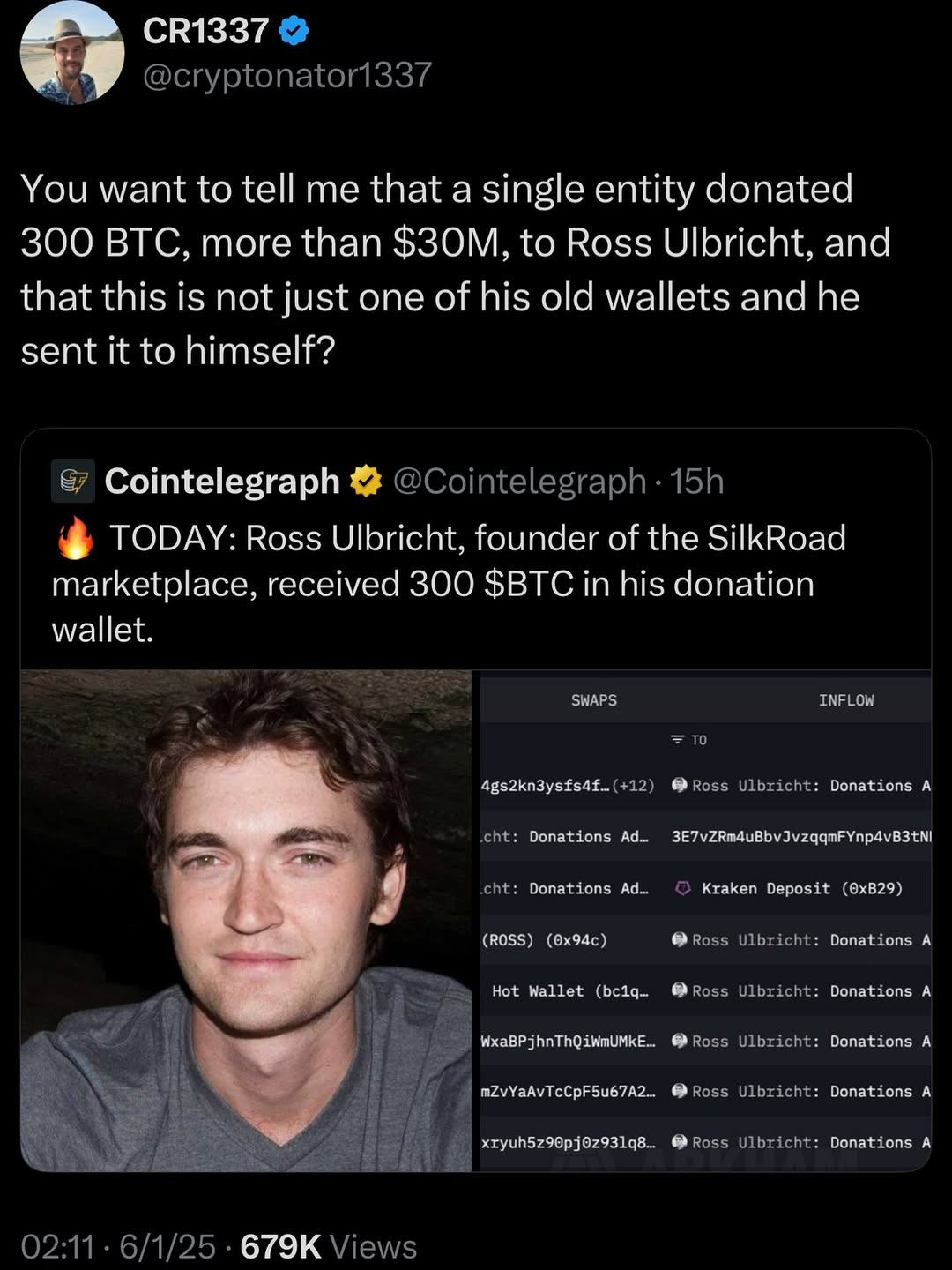 💰 300 Bitcoin Mysteriously Sent to Sil Road Founder Ross Ulbricht’s Donation Wallet