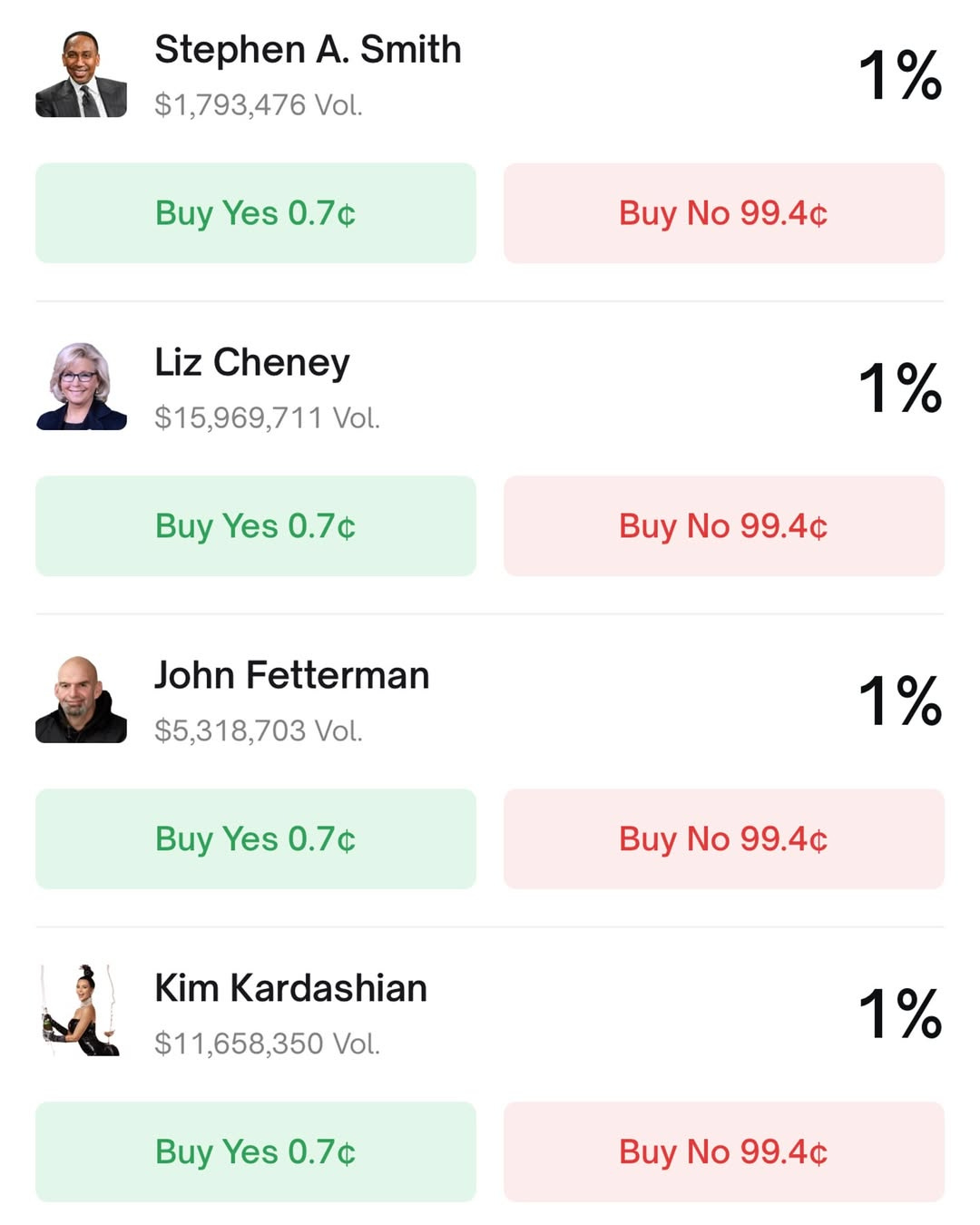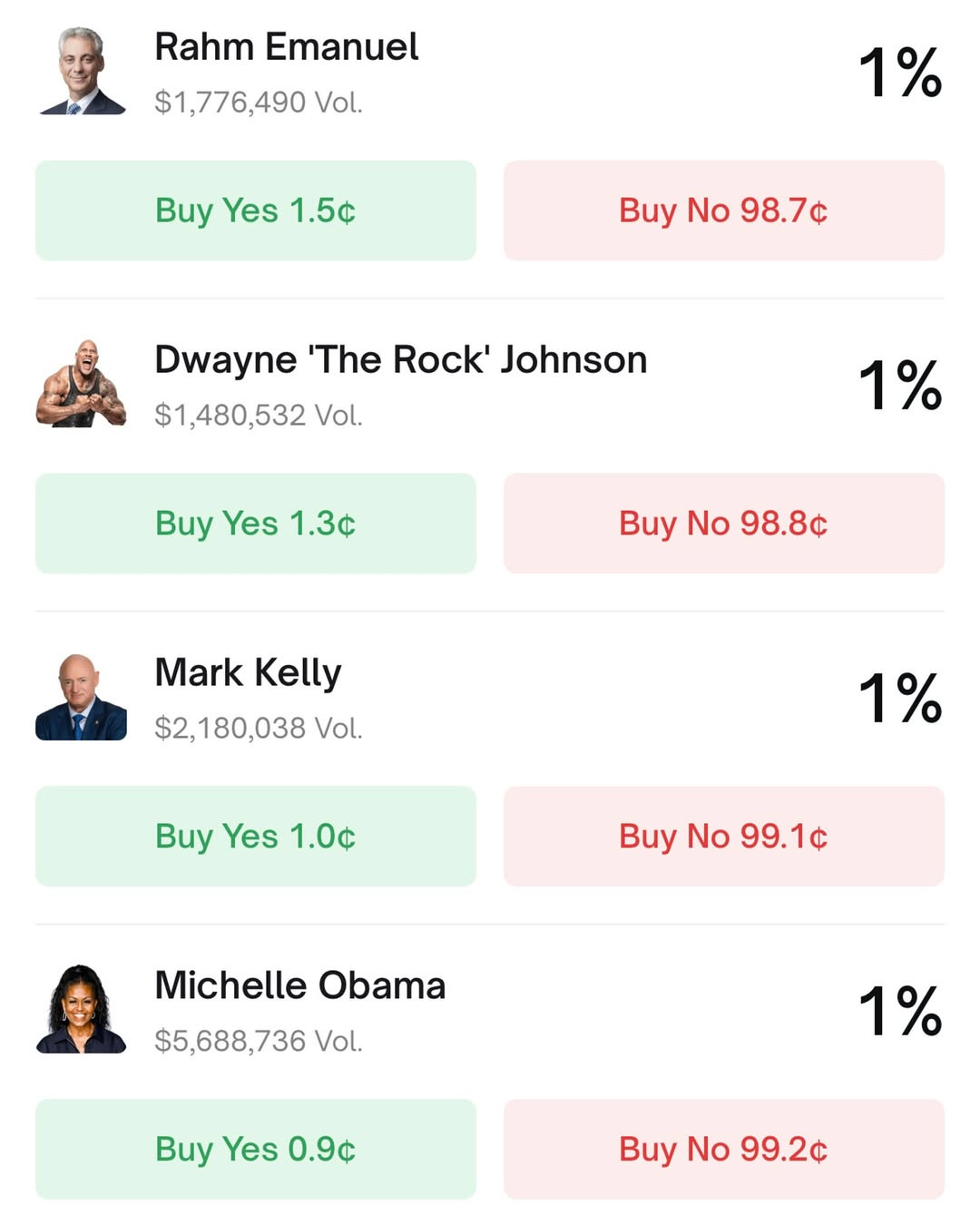 π€ A lot of interesting names in the 1% range. Rahm Emanuel feels undervalued. Seems like he is gonna run for sure and he is prob smarter and has more rizz that these other guys ranked ahead of him. And he certainly never smashed out a Guilfoyle.