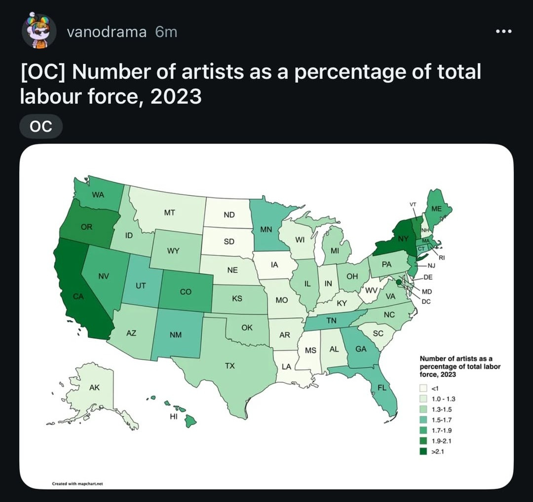 🇺🇸 Number of Artists as a Percentage of Total Labor Force by U.S. State (2023)