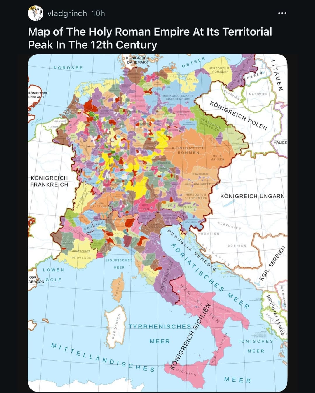 PLUS, a map of the Holy Roman Empire at its territorial peak in the 12th century.