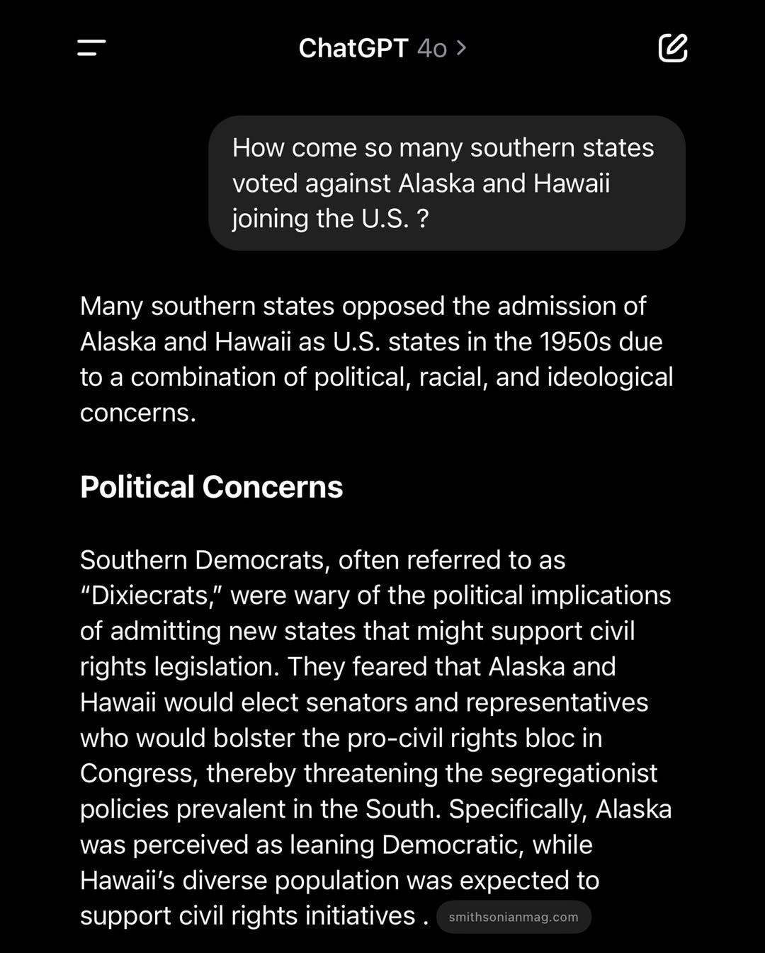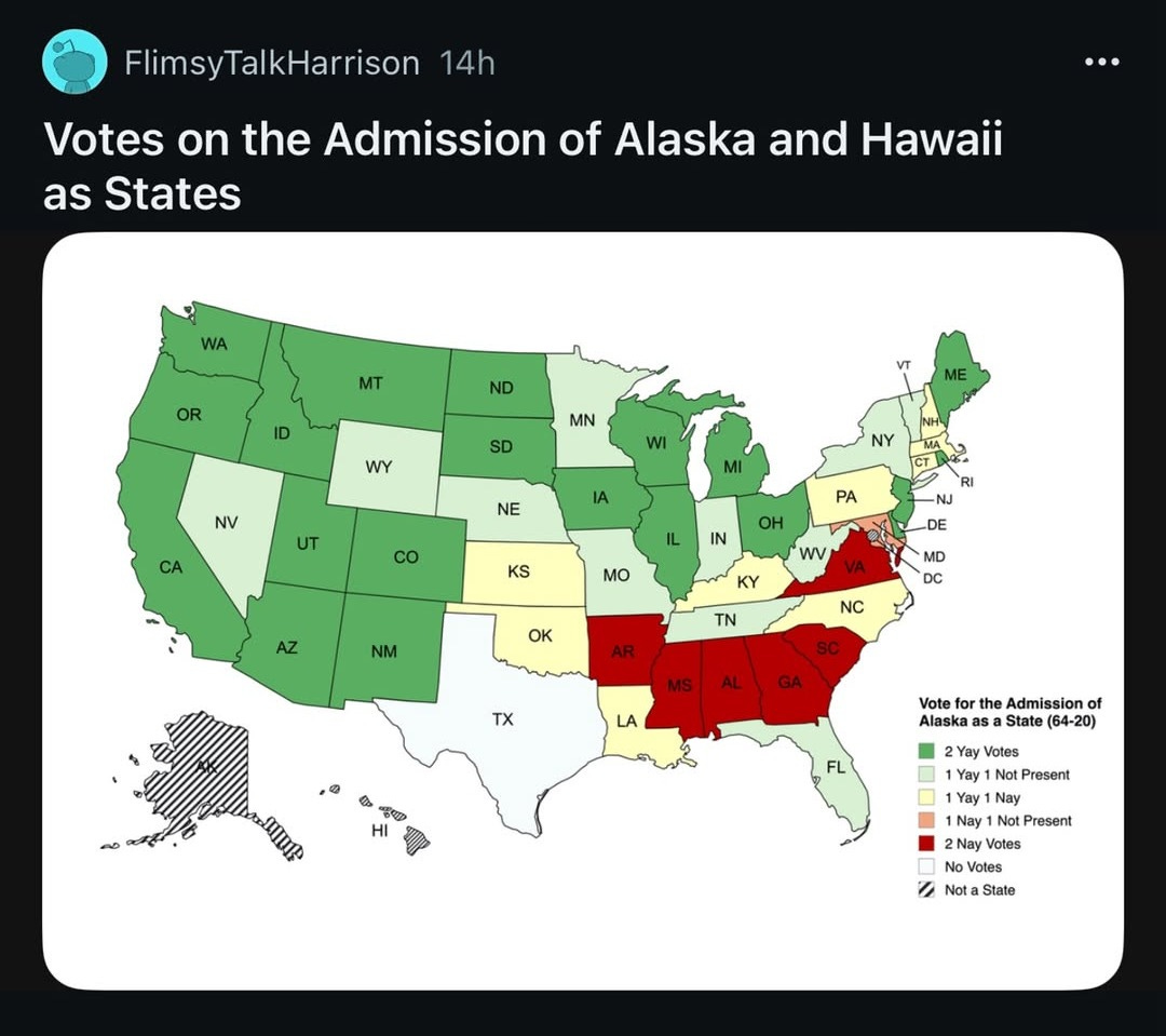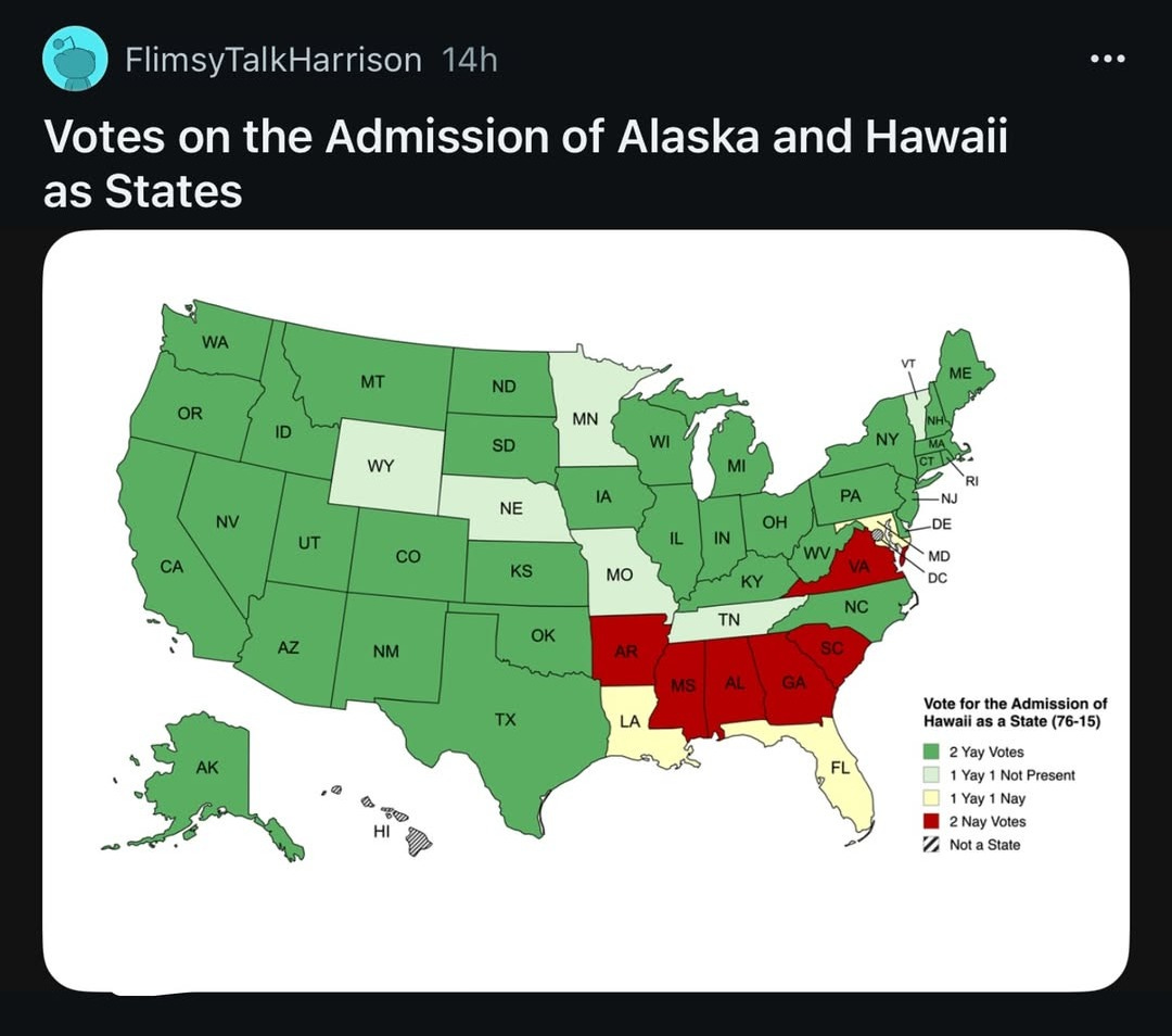 Today I learned the Dixiecrats voted against Hawaii and Alaska joining the U.S. in 1958/1959.