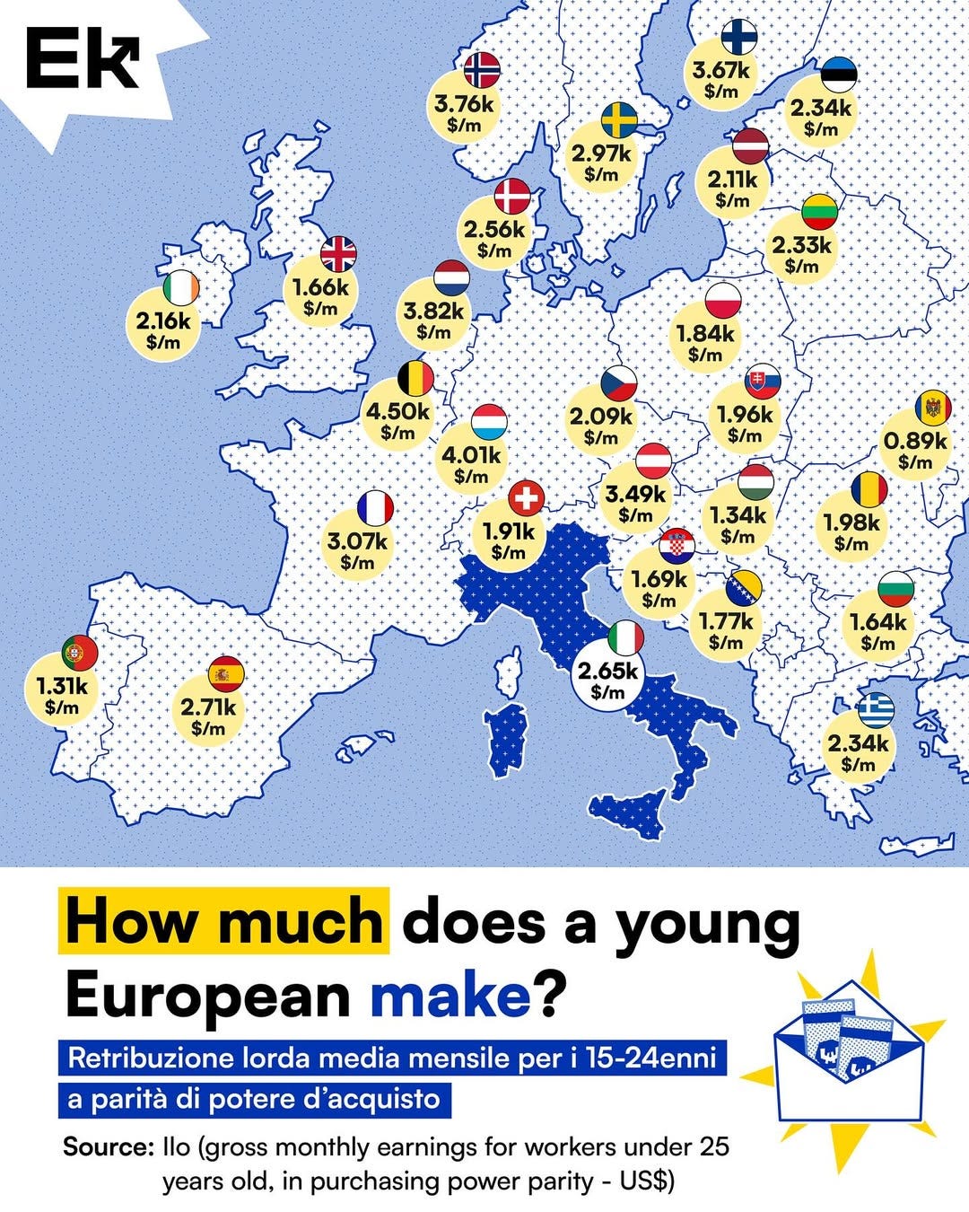 It should also be considered that the data is at purchasing power parity, which means that it is normalized for the different cost of living between countries. In practice, the figure suggests that young people in Italy earn on average an amount equivalent to earning $2,653 living in the United States.