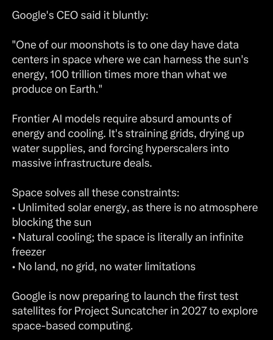 I do like the idea of solar powered data centers in space. Maybe we can use them to block a bit of sunlight to save us from global warming too. 🙏