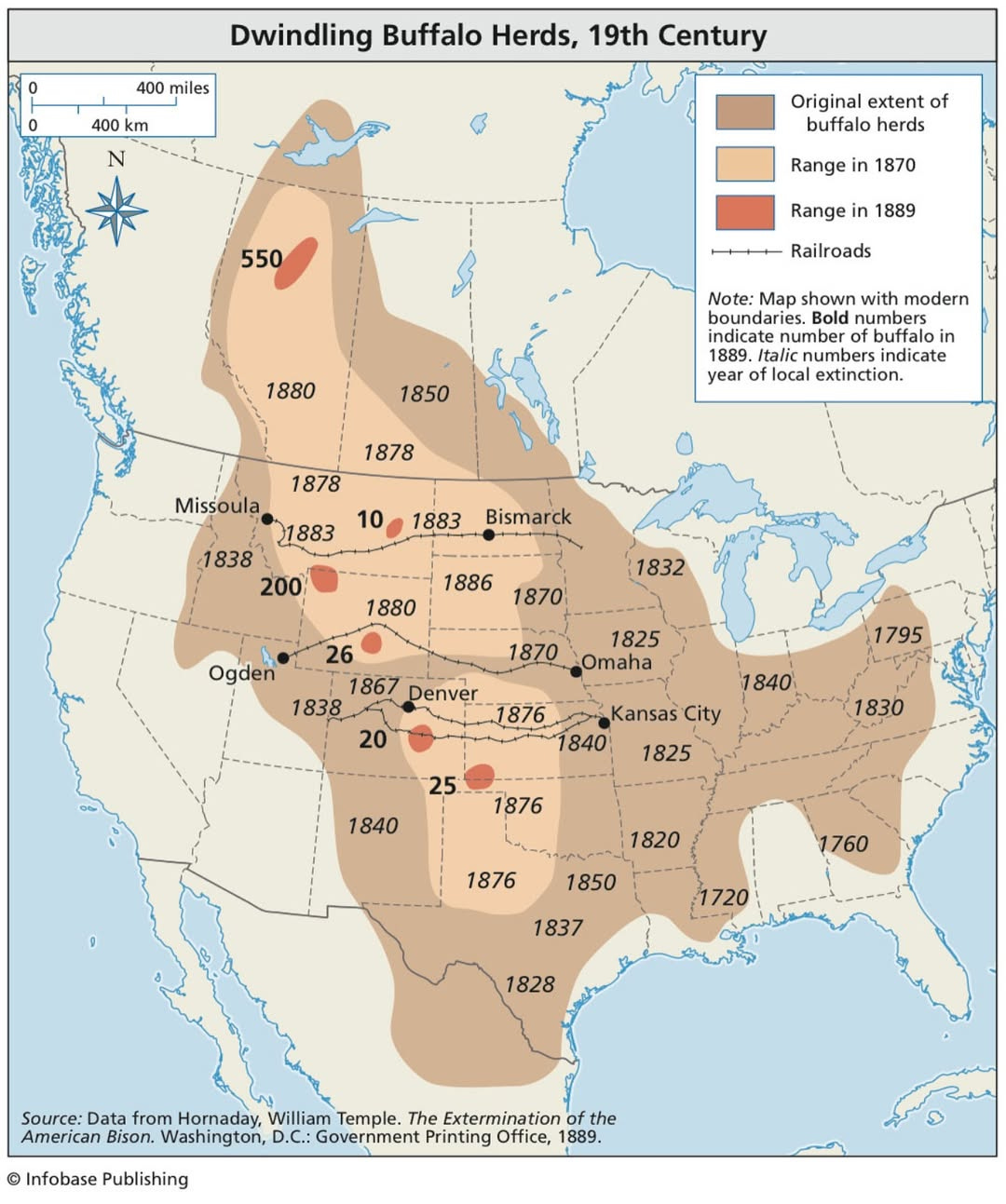 In 1800, tens of millions of buffalo roamed North America. By the late 1800s, after the railroads expanded and the slaughter peaked, fewer than 1,000 remained in the wild.